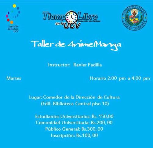 Taller de AnimeManga Vinculo UCV 3:17 p.m. Anime Manga, Centro de Estudiantes, Cultura, Movimiento Vínculo, Taller, Tiempo Libre en la UCV, UCV, UCVistas No comments Si te gusta el Anime y el Manga y deseas aprender a dibujarlo inscríbete en el Taller de AnimeManga. Los Martes de 2:00pm a 4:00pm en el Comedor de la Dirección de Cultura. Para mayor información @dir_cultura_ucv Share This: Facebook Twitter Google+ Stumble Digg Enviar esto por correo electrónicoBlogThis!Compartir en XCompartir en Facebook