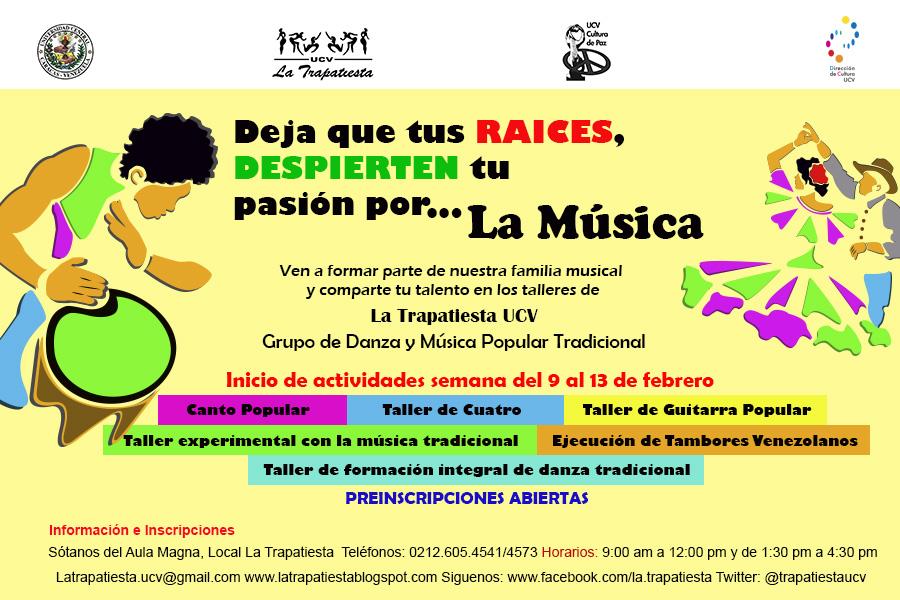 Talleres de Danza y Música popular tradicional. Vinculo UCV 8:10 a.m. Centro de Estudiantes, Cultura, Iniciando Procesos, La Nueva Escuela, Movimiento Vínculo, Talleres de Danza y Música popular tradicional, UCV, UCVistas No comments A partir de este 9 de febrero puedes participar en los Talleres de Danza y Música Popular Tradicional que la Dirección de Cultura de la UCV te ofrece. Para mayor información visita: @dir_cultura_ucv y @TrapatiestaUCV Share This: Facebook Twitter Google+ Stumble Digg Enviar esto por correo electrónicoBlogThis!Compartir en XCompartir en Facebook