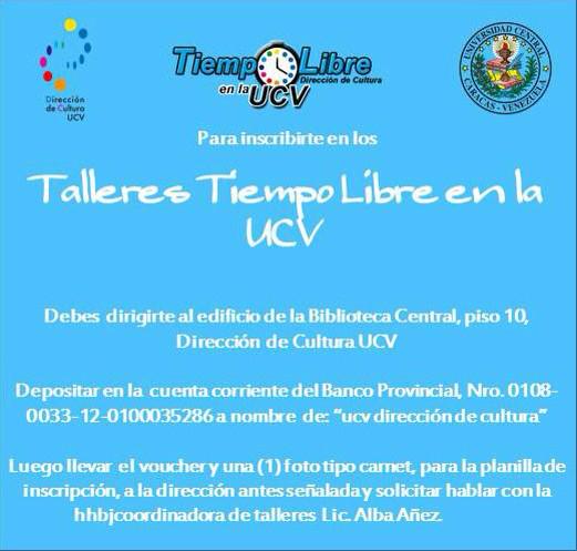 NOTA: para las inscripciones favor dirigirse al Edif. de la Biblioteca Central UCV. Piso 10, Direccion de Cultura UCV.