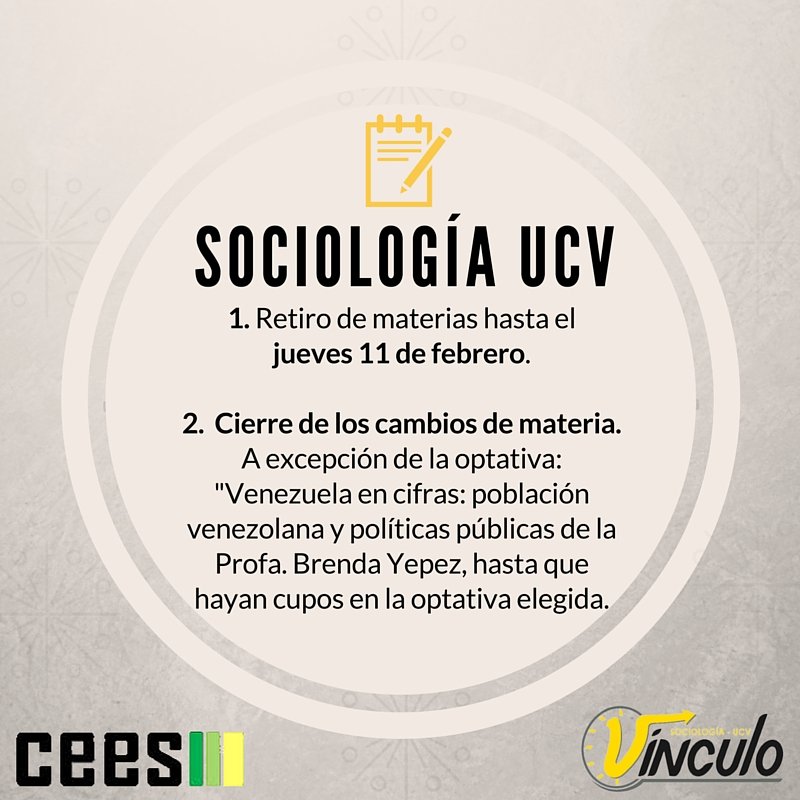 Los cambios de materia por Control de Estudios ya han finalizado, sin embargo las personas que inscribieron la optativa de la profa. Brenda Yépez "Venezuela en cifras: población venezolana y políticas públicas", la cual se cerró, tendrán oportunidad de hacer el cambio de materia hasta que hayan cupos en las demás optativas.